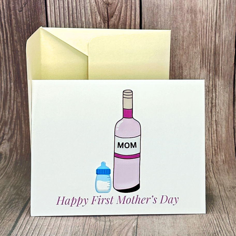 Celebrate her first Mother's Day with our unique Mother's Day Bottle card! This delightful card features charming illustrations of wine and baby bottles, perfectly capturing the joy and balance of new motherhood.