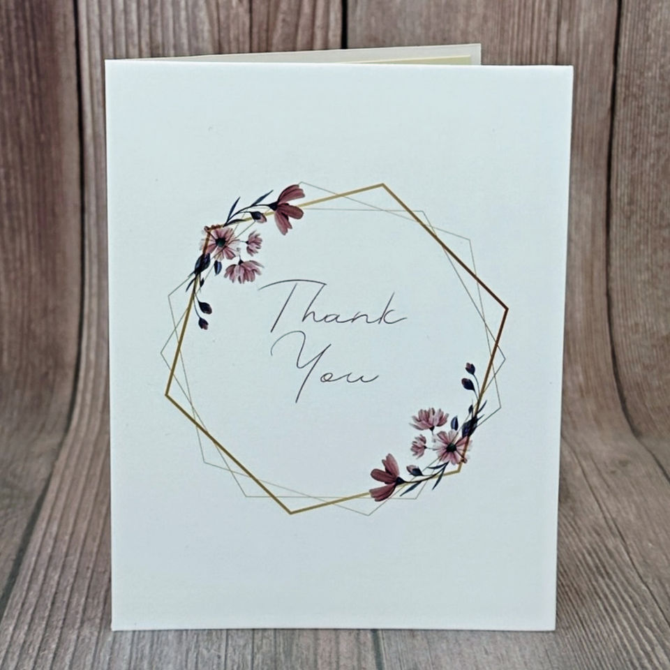 On the front of this card, the words "Thank You" are printed in blush pink and centered in a floral wreath design. Inside is a blank cream-colored insert for you to write your personal message to the recipient. This card comes with a red envelope that is pre-taped and ready to be sealed.