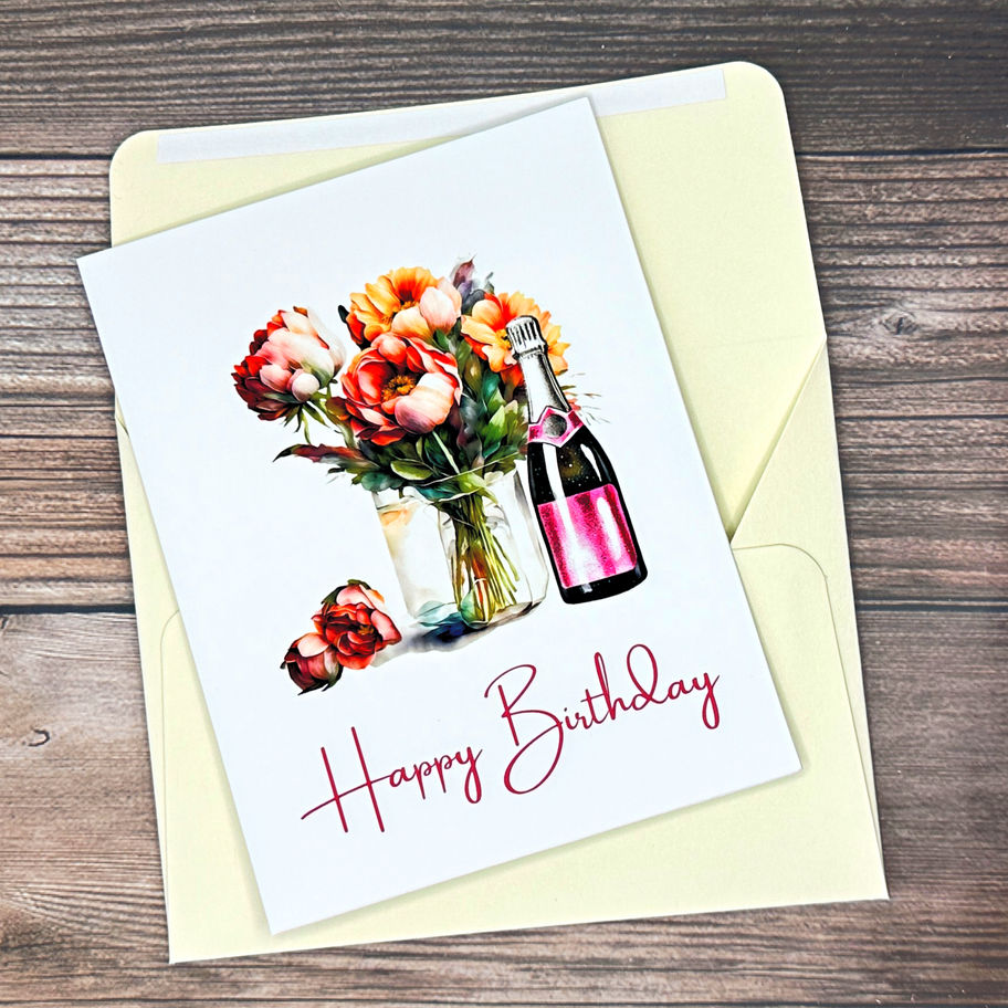 On the front of this card is a bouquet of flowers and a bottle of champagne, and below are the words "Happy Birthday" printed in pink. Inside is a blank cream-colored insert for you to write your personal message to the recipient. This card comes with a cream-colored envelope that is pre-taped and ready to be sealed.