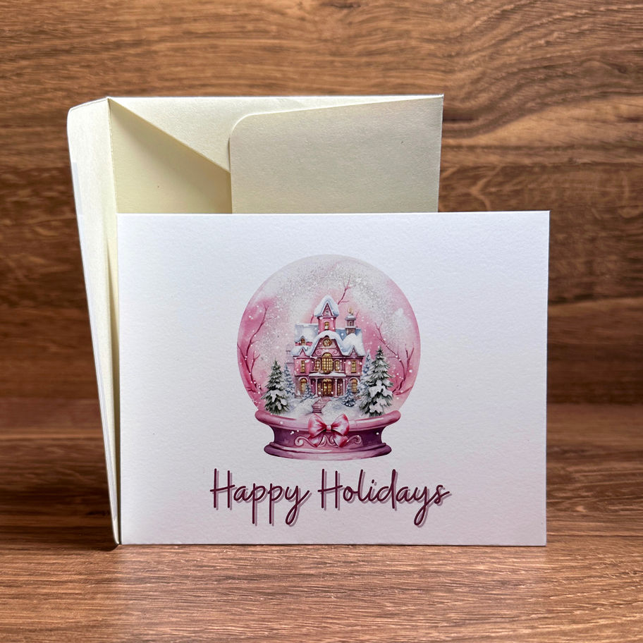 On the front of this card is a pink snowglobe featuring a snowy scene. Below, in dark pink, are the words, "Happy Holidays." Inside is a blank, cream-colored insert for you to write your personal message to the recipient. This card comes with a cream-colored envelope that is pre-taped and ready to be sealed.