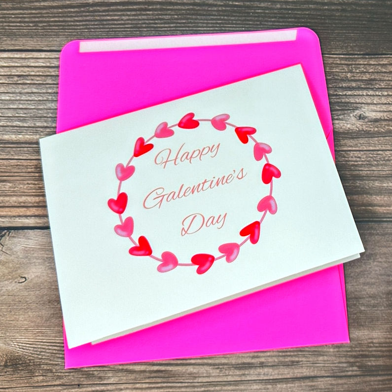 On the front of this card, in the center of a ring of hearts, are the words "Happy Galentine's Day" printed in a light pink. Inside is a blank, cream-colored insert for you to write your personal message to the recipient. This card comes with a pre-taped pink envelope that is ready to be sealed.