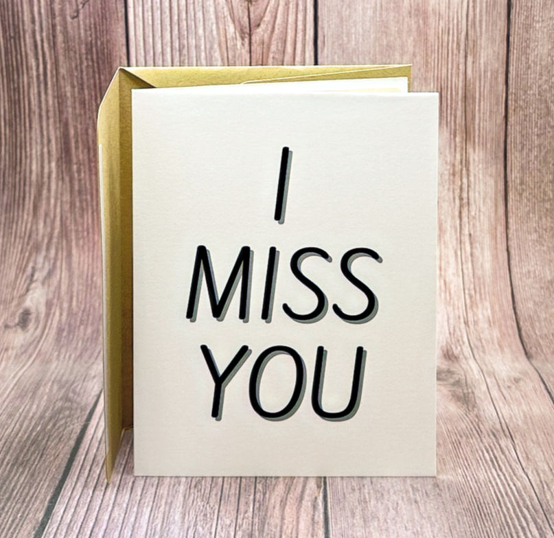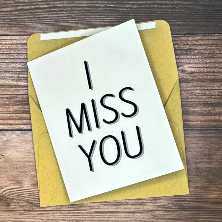 On the front, printed in black with a grey shadow, are the words "I Miss You." Inside is a blank cream-colored insert for you to write your personal message to the recipient. This card comes with a parchment-colored envelope that is pre-taped and ready to be sealed.