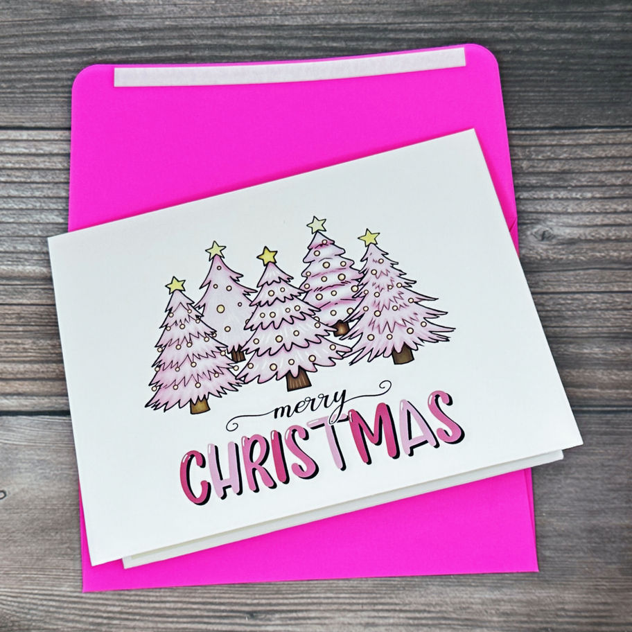 On the front of this card are five pink Christmas trees, with the words "Merry Christmas" below. Inside is a blank cream-colored insert for you to write your personal message to the recipient. This card comes with either a pink or green envelope, which is pre-taped and ready to be sealed.