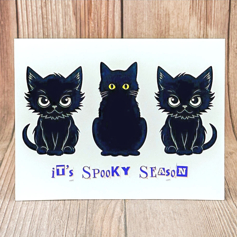 On the front of this card are three spooky-looking cats. Below, in purple, are the words "It's Spooky Season." Inside is a blank cream-colored insert for you to write your personal message to the recipient. This card comes with a yellow envelope that is pre-taped and ready to be sealed.