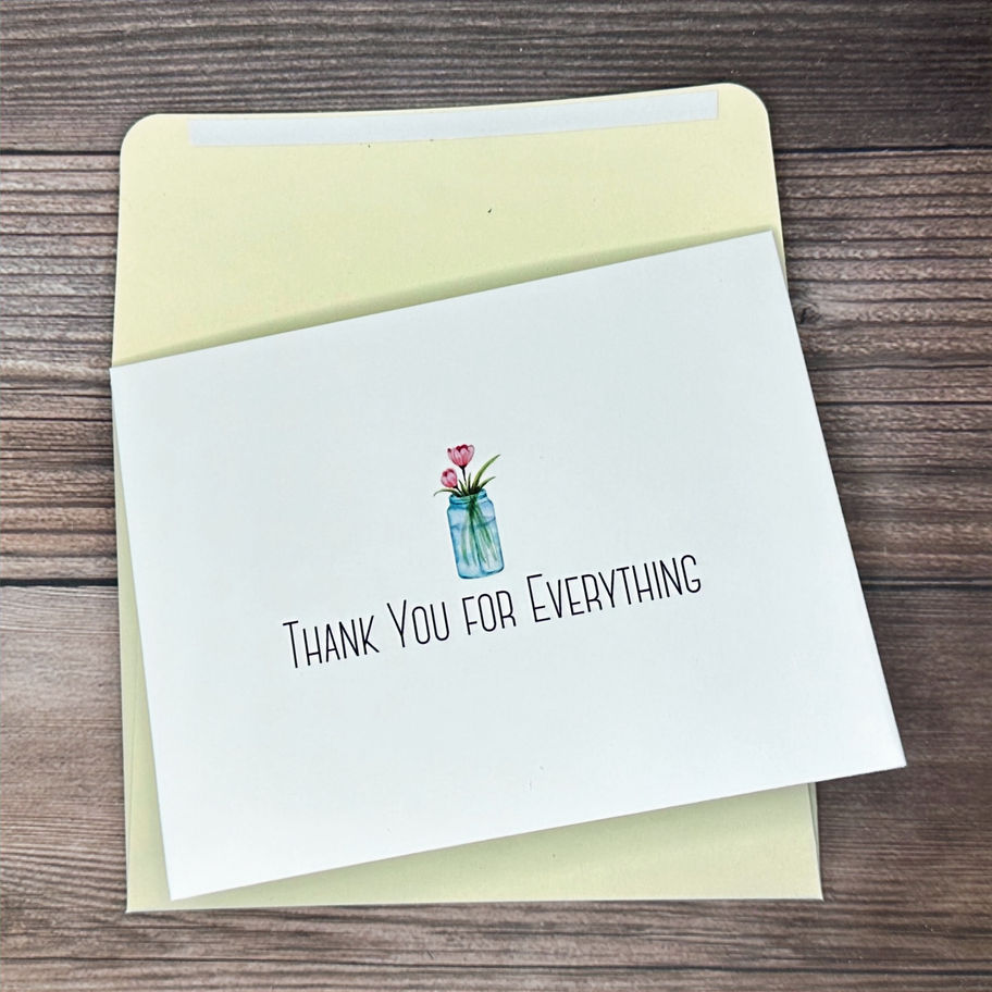 On the front of this card is a blue vase with pink flowers. Below it, printed in black, are the words "Thank You for Everything." Inside is a blank cream-colored insert for you to write your personal message to the recipient. This card comes with a cream-colored envelope that is pre-taped and ready to be sealed.