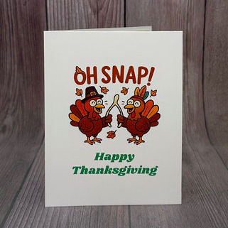 On the front of this card are two chickens splitting a wishbone, with the words "Oh Snap!" above. Below are the words, "Happy Thanksgiving." Inside is a blank, cream-colored insert for you to write your personal message to the recipient. This card comes with a yellow envelope that is pre-taped and ready to be sealed.