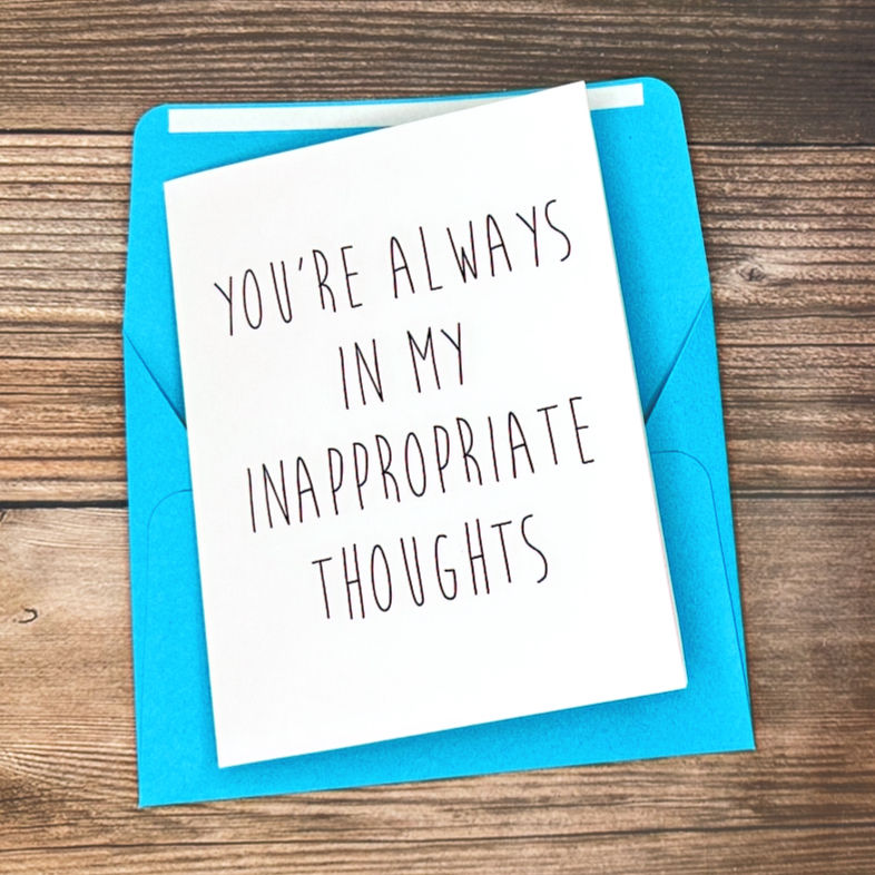On the front of this card, printed in black, are the words "You're Always in My Inappropriate Thoughts." Inside is a blank cream-colored insert for you to write your personal message to the recipient. This card comes with your choice of envelope that is pre-taped and ready to be sealed.